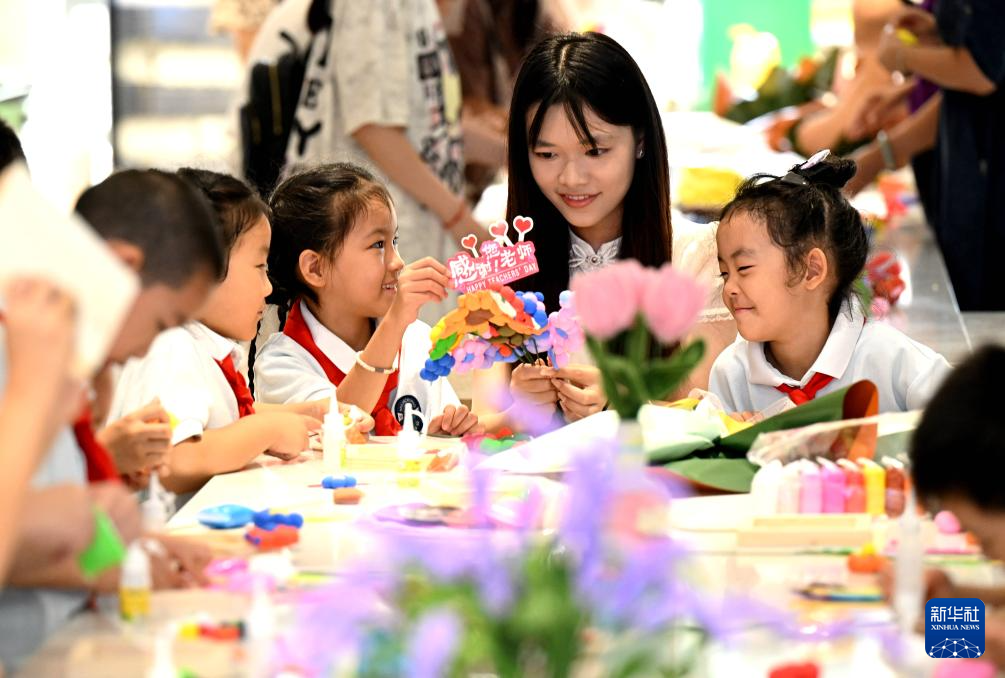 9月9日,在河北省石家莊市柏林莊學校開展的“黏土做花寄師恩”主題活動中,孩子們用粘土制作花束,為老師送上節(jié)日的祝福。