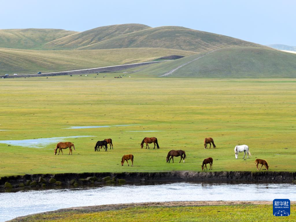 9月14日在內(nèi)蒙古呼倫貝爾市陳巴爾虎草原拍攝的馬群(無人機照片)。