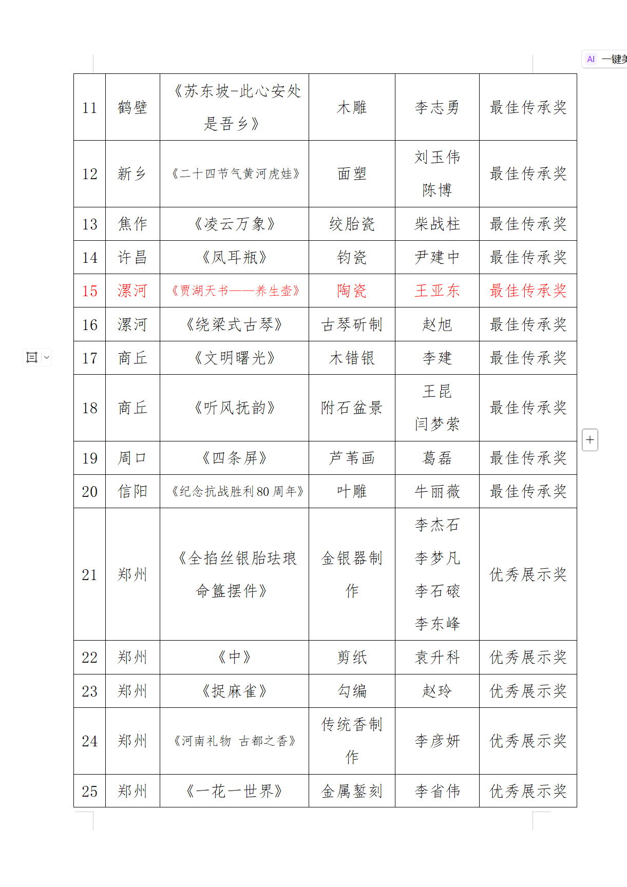 據(jù)悉,根據(jù) 2025 河南惠民文化活動(dòng)總體安排,河南文化館組織開(kāi)展的第六屆河南民間藝術(shù)展作品征集工作,經(jīng)全省縣、市各級(jí)推薦,共收到作品 30 類 1500 余件。經(jīng)專家評(píng)審,共評(píng)出最佳傳承獎(jiǎng)20 個(gè),優(yōu)秀獎(jiǎng)40 個(gè),別具匠心獎(jiǎng)60 個(gè),榮譽(yù)參展獎(jiǎng)20 個(gè)。(漯河市廣播電視臺(tái)網(wǎng)絡(luò)部記者:柴全偉)